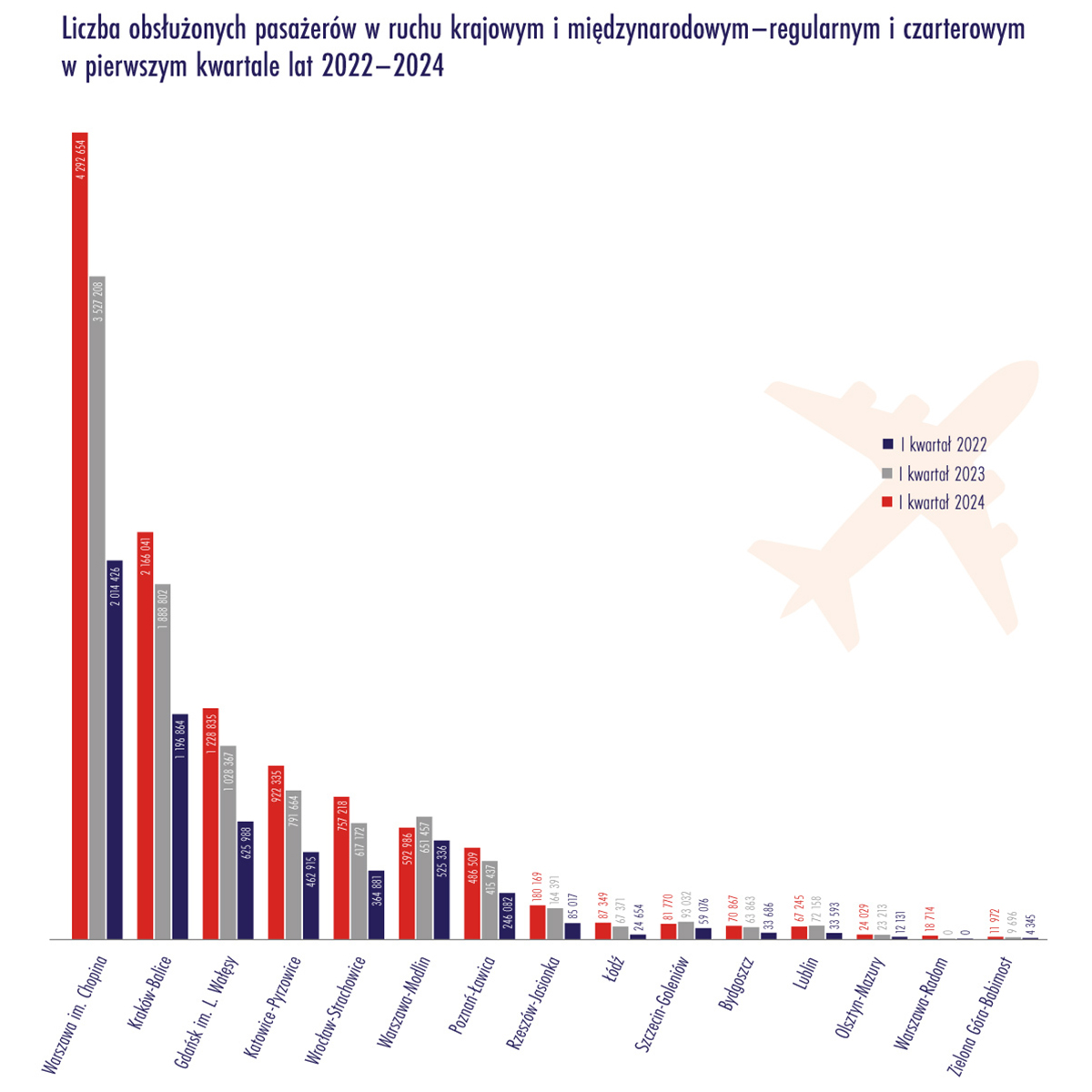Wśród portów lotniczych liderem pozostaje Lotnisko Chopina w Warszawie, które obsłużyło w pierwszym kwartale roku prawie 4,3 mln pasażerów i osiągnęło największy wzrost ilościowy względem analogicznego okresu 2023 r. (+765 tys. pasażerów). W dalszej kolejności najwięcej pasażerów i największe wzrosty pod względem liczby obsłużonych pasażerów wykazały Międzynarodowy Port Lotniczy im. Jana Pawła II Kraków-Balice (2,2 mln pasażerów, +277,2 tys.) oraz Port Lotniczy Gdańsk im. Lecha Wałęsy (1,2 mln pasażerów, +200,5 tys.). Największe natomiast wzrosty procentowe odnotowały lotniska w Łodzi (+29,7 proc.), Zielonej Górze (+23,5 proc.) oraz Wrocławiu (22,7 proc.).