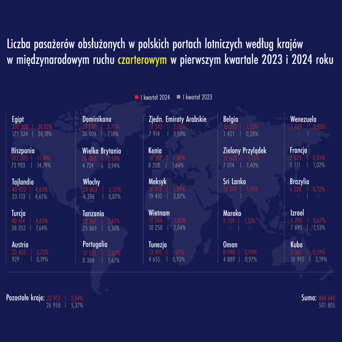 W pierwszym kwartale 2024 roku w ruchu międzynarodowym i krajowym polskie porty lotniczy obsłużyły 869,5 tys. pasażerów czarterowych (+72,5 proc. do analogicznego okresu 2023 r.). Najwięcej osób podróżowało do Egiptu (330,3 tys. pasażerów, +158,8 tys. do pierwszego kwartału roku 2023), Hiszpanii (102 tys., +28 tys.) i Tajlandii (40,4 tys., +17,3 tys.).