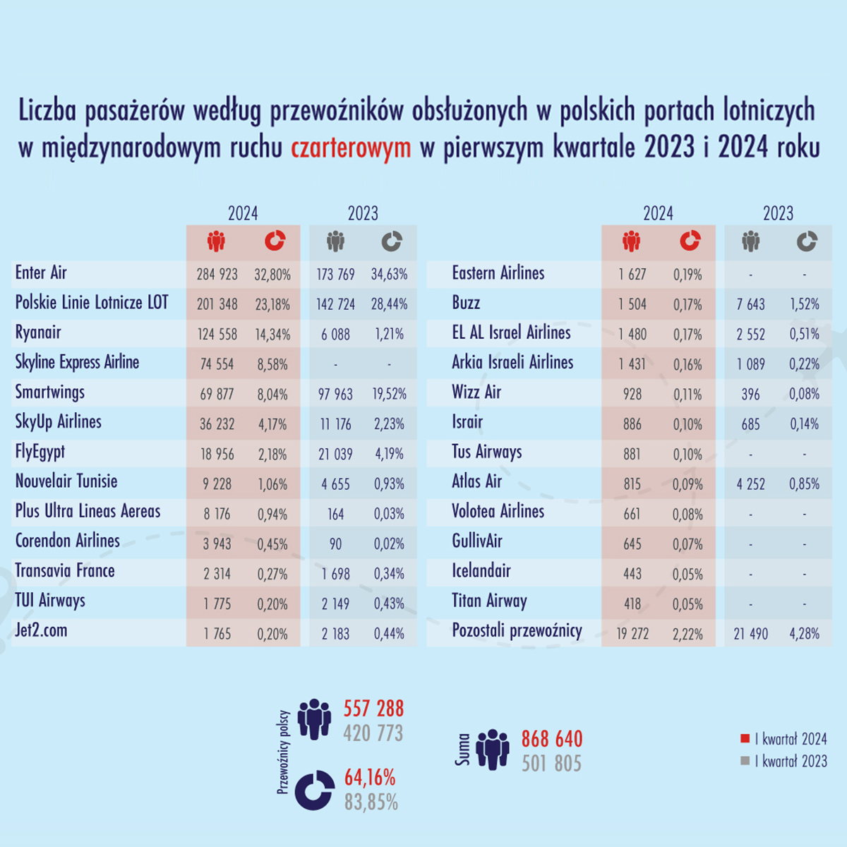 Najwięcej pasażerów w ruchu czarterowym w pierwszym kwartale 2024 roku obsłużyły Lotnisko Chopina w Warszawie (362,9 tys., +184,3 tys. pasażerów do analogicznego okresu 2023 r.), Port Lotniczy Katowice w Pyrzowicach (291,9 tys., +115,7 tys.) oraz Port Lotniczy Poznań-Ławica (73,2 tys., +14,9 tys.).