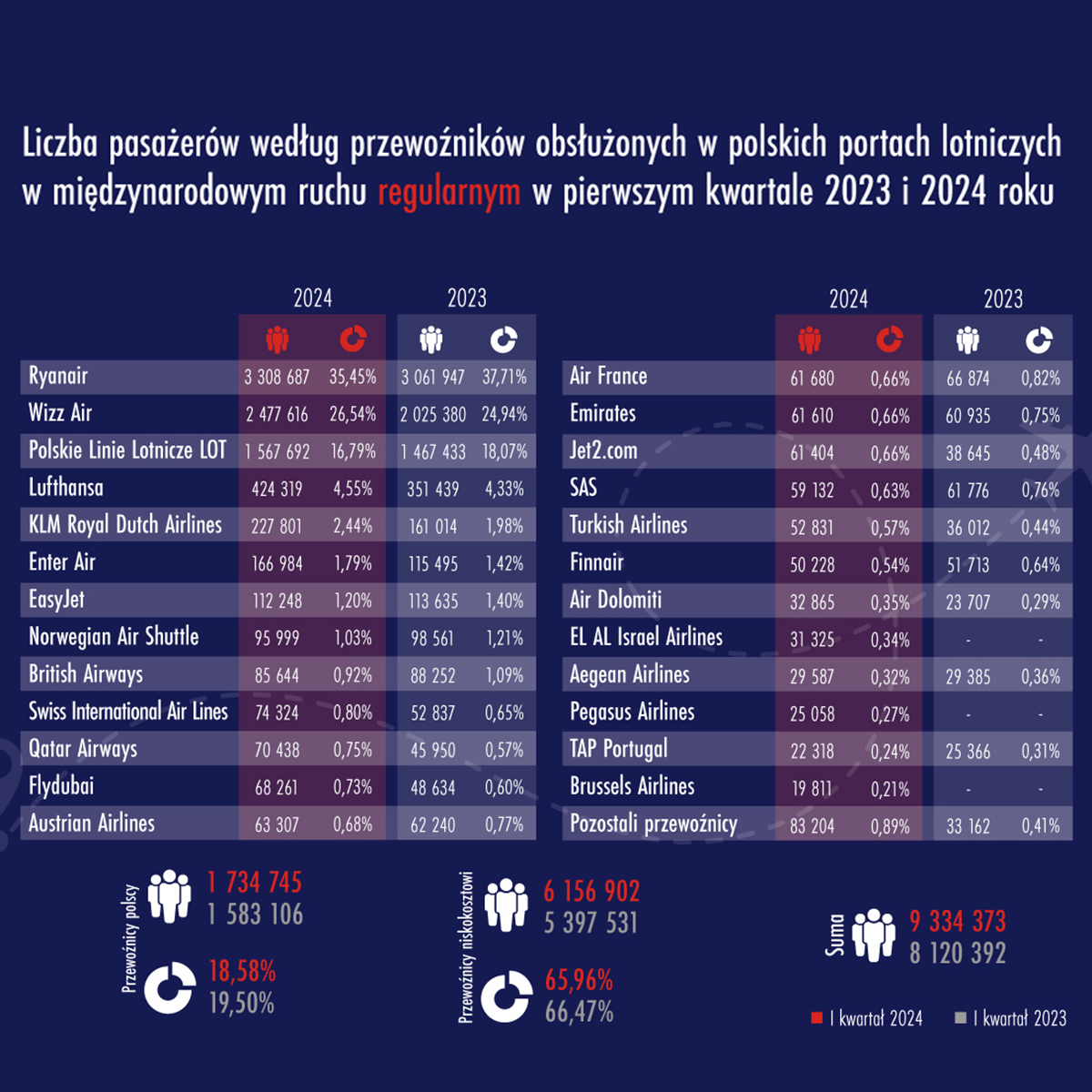 Wśród przewoźników najwięcej pasażerów w międzynarodowym ruchu regularnym w pierwszym kwartale 2024 roku obsłużyły linie: Ryanair (3,3 mln, +246,7 tys. pasażerów do pierwszego kwartału 2023 r.), Wizz Air (2,5 mln, +452,2 tys.) oraz PLL LOT (1,6 mln, +100,3 tys.).