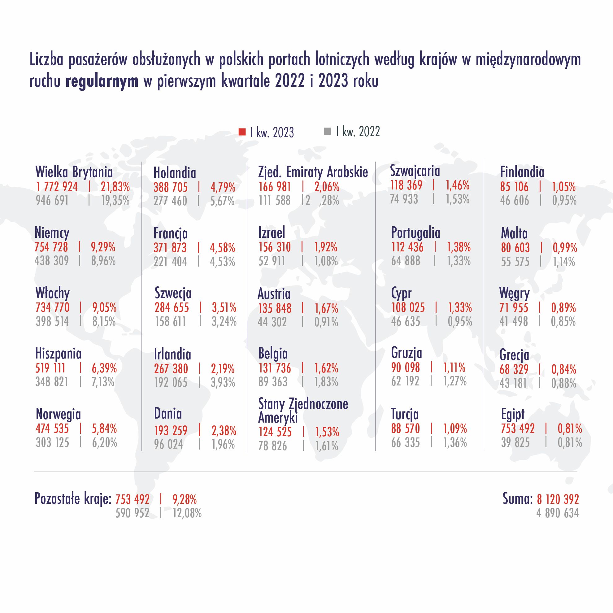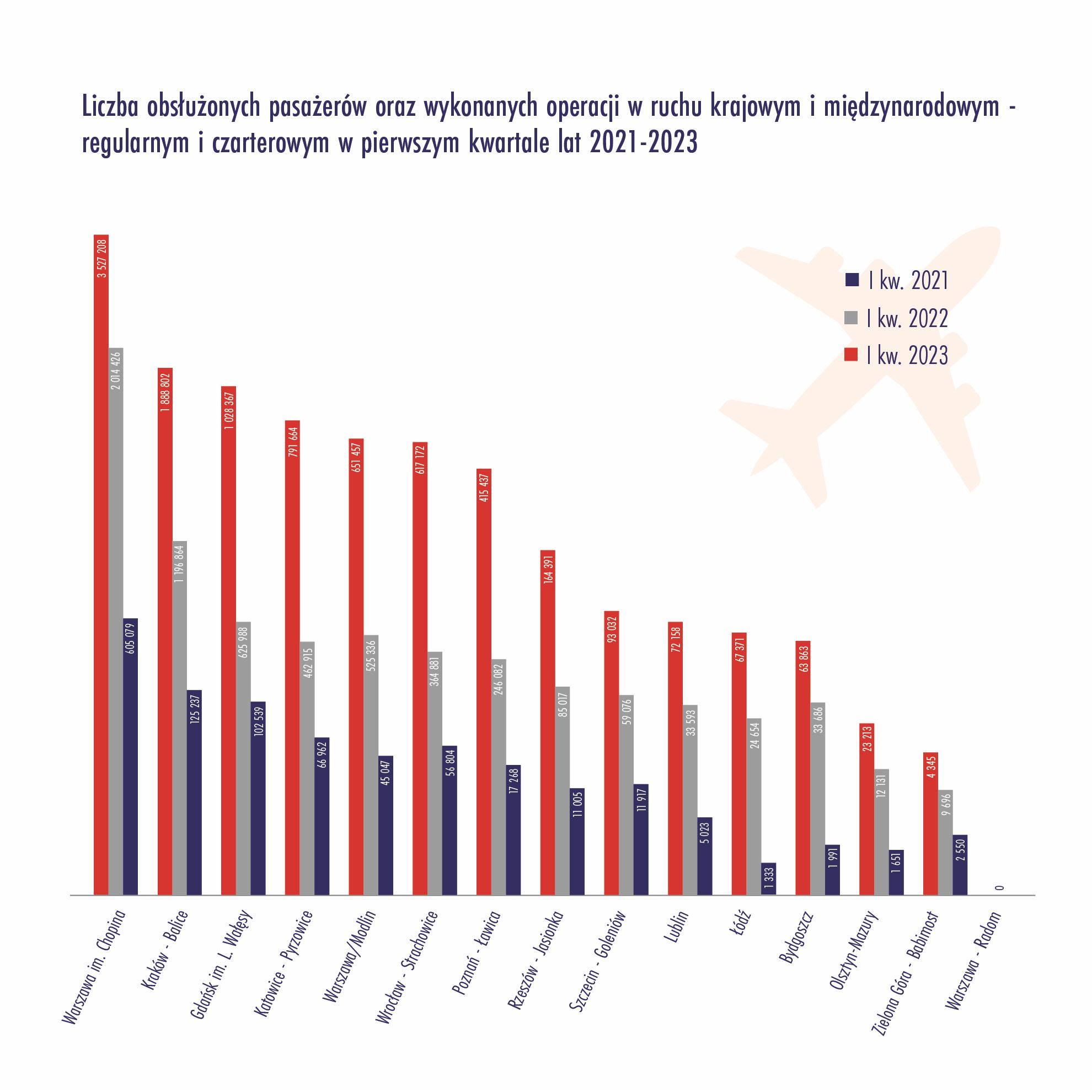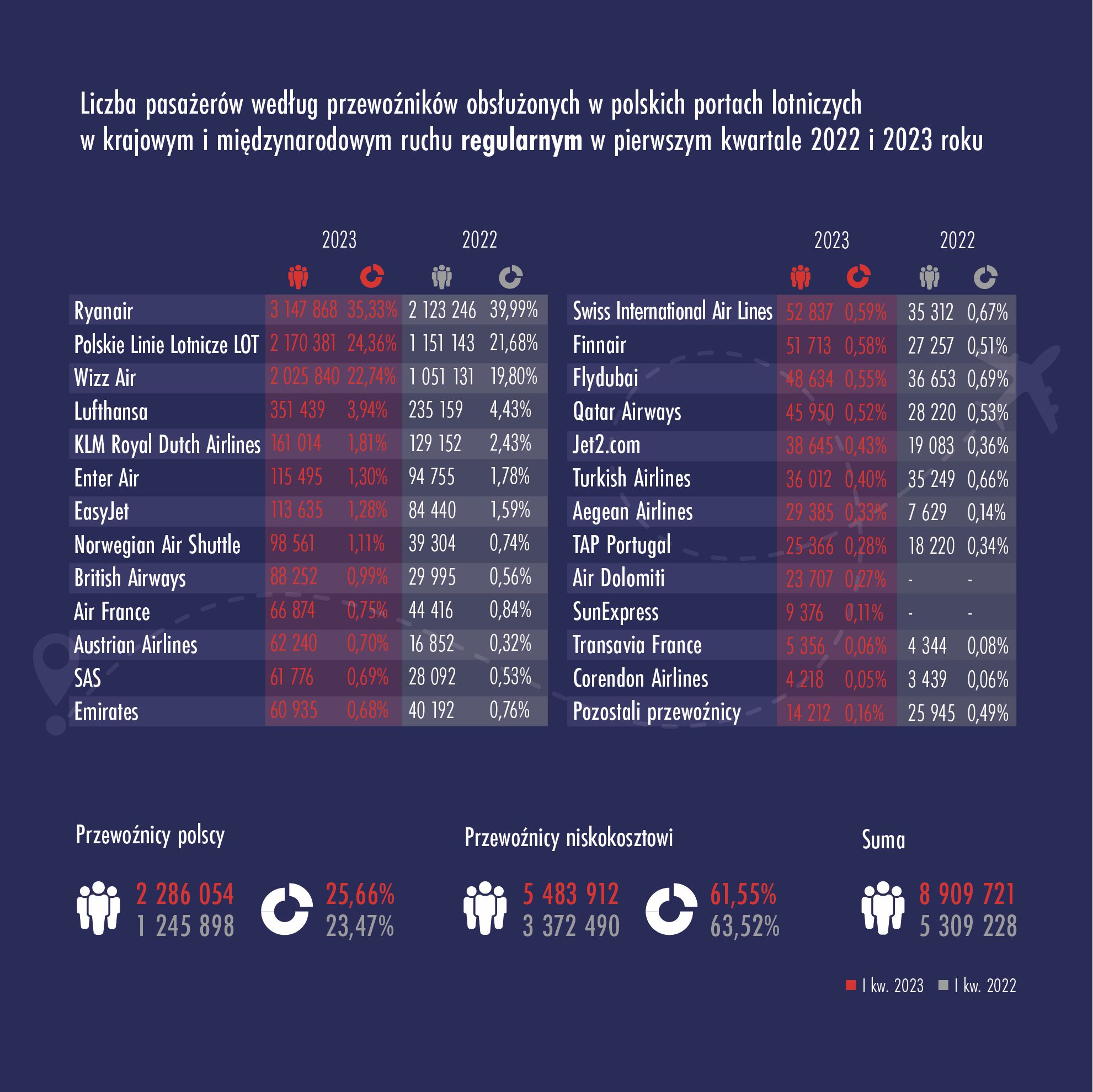 Najwięcej pasażerów w ruchu regularnym przyjęły: Lotnisko Chopina w Warszawie (3,3 mln, +1,5 mln do roku 2022), Port Lotniczy Kraków-Balice (1,9 mln, +676,6 tys. do roku 2022), Port Lotniczy Gdańsk (1 mln, +396,1 tys. do roku 2022). Największymi wzrostami względem pierwszego kwartału 2019 roku mogły pochwalić się porty lotnicze: Kraków-Balice (+253,5 tys. pasażerów), Katowice w Pyrzowicach (+45,3 tys.) i Gdańsk (+33,3 tys.)