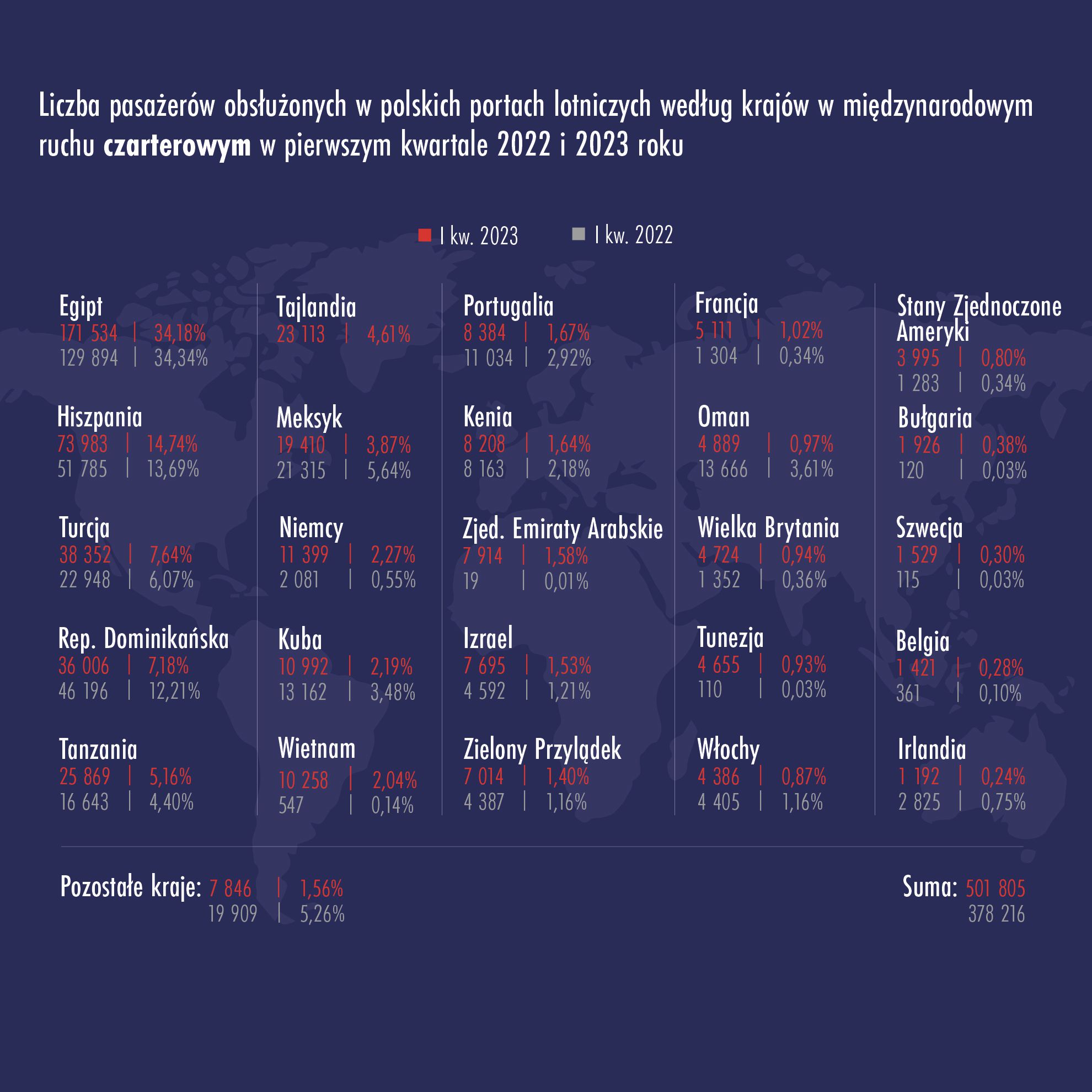 W polskich portach lotniczych w pierwszym kwartale 2023 roku odprawiono w ruchu międzynarodowym i krajowym 504,1 tys. pasażerów czarterowych (+32,7 proc. do 2022 r. i +21,7 proc. do 2019 r.). Najwięcej osób podróżowało do Egiptu, Hiszpanii i Turcji. Największe wzrosty w stosunku do pierwszego kwartału 2019 roku odnotowano w przypadku: Egiptu (+58,5 tys. pasażerów), Dominikany (+18,4 tys.) i Hiszpanii (+15,6 tys.).