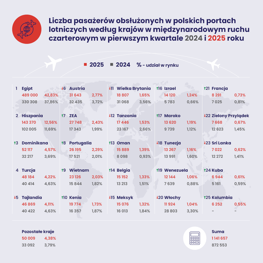 W pierwszym kwartale 2025 roku w czarterowym ruchu międzynarodowym polskie porty lotnicze obsłużyły 1,1 mln pasażerów (+30,8 proc. do 2024 r.). Najwięcej osób podróżowało do/z Egiptu (489 tys. pasażerów, +158,7 tys. do 2024 r.), Hiszpanii (143,4 tys., +41,4 tys.) i na Dominikanę (52,1 tys., +19,9 tys.).
