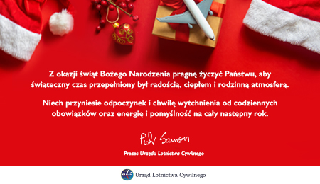 Z okazji nadchodzących Świąt Bożego Narodzenia, w imieniu własnym oraz pracowników Urzędu Lotnictwa Cywilnego życzę, żeby ten świąteczny czas przełniony był radością, ciepłem i rodzinną atmosferą.Niech przyniesie odpoczynek i chwilę wytchnienia od codziennych obowiązków oraz energię i pomyślność na cały Nowy 2022 Rok.