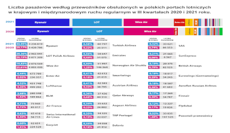 W III kwartale 2021 roku nastąpiła znaczna odbudowa ruchu lotniczego. Słabe wyniki w I półroczu spowodowane były wiosenną fala zachorowań na COVID-19. Ostatecznie w trzech pierwszych kw. 2021 roku obsłużono prawie 13 mln pasażerów (+67% proc. do 2020 i -66 proc. do 2019) i prawie 123 tys. operacji lotniczych (-4 proc. do 2020 i -60 proc. do 2019).