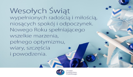 W imieniu własnym oraz pracowników Urzędu Lotnictwa Cywilnego życzę Państwu, aby nadchodzące Święta Bożego Narodzenia były wypełnione radością oraz życzliwością. Niech moc Wigilijnego Wieczoru przyniesie spokój i radość, a Nowy Rok obdaruje pomyślnością i szczęściem.Pragnę również podziękowac wszystkim, którym leży na sercu dobro polskiego lotnictwa. Dzięki Waszemu wsparciu i zaangażowaniu możemy wspólnie przyczyniać się do rozwoju transportu lotniczego.