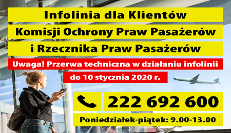 Informujemy, że do 10 stycznia 2020 roku infolinia Komisji Ochrony Praw Pasażerów oraz Rzecznika Praw Pasażerów będzie nieczynna w związku z przerwą techniczną.